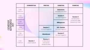 Wir freuen uns auf ein geniales Wochenende, das wir gemeinsam als Kirche verbringen dürfen. Dich erwarten starke Gottesdienste, abwechslungsreiches Freizeitprogramm, leckeres Essen und gute Gemeinschaft.