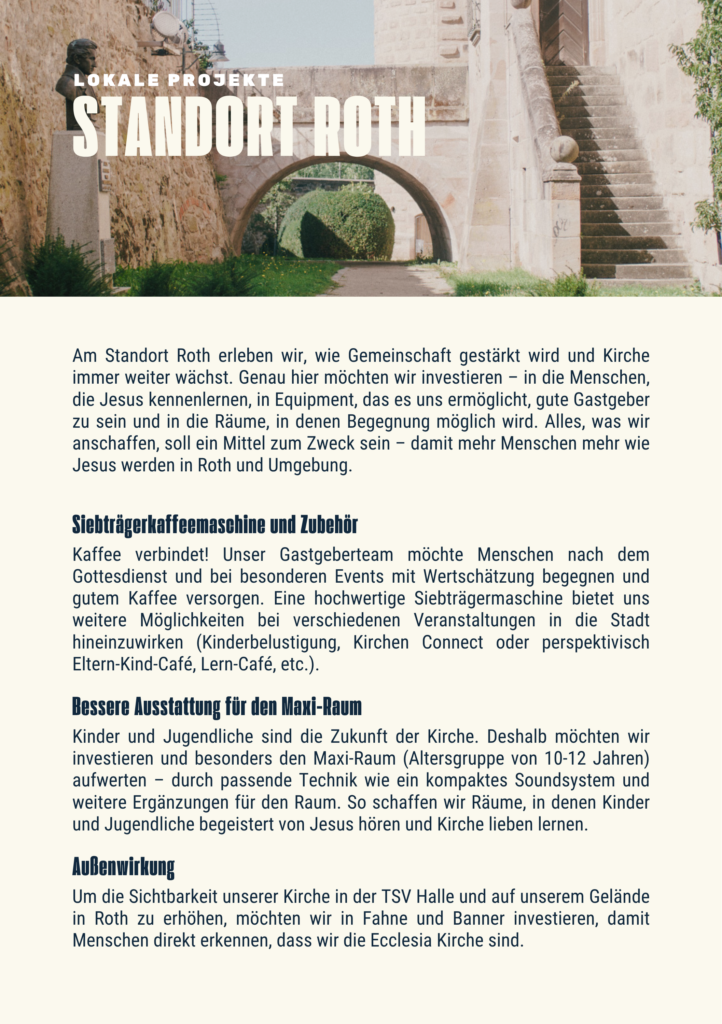 Dabei handelt es sich nicht nur um Projekte unserer Kirche: Wir sind dankbar, dass das Reich Gottes größer ist als die Ecclesia Kirche und sind davon überzeugt, dass Geben besser ist als Nehmen. In Anlehnung an Apostelgeschichte 1:8 sind die Spendenprojekte in drei Kategorien unterteilt:
